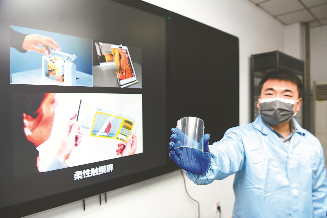 ▲ 2018年第四季度,合肥微晶石墨烯納米銀線復(fù)合柔性透明導電膜成功量產(chǎn),圖為呂鵬展示應(yīng)用此項技術(shù)的柔性觸摸屏產(chǎn)品